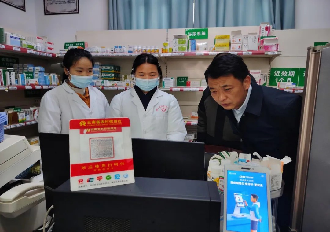 调研组实地察看了解文山州砚山县盘龙乡卫生院响水龙村卫生室“两病”门诊用药保障、智慧医保“村村通”刷脸设备应用及药品追溯码扫码上传工作,与看病就医群众交流了解参保及费用报销等情况。调研组还深入盘龙乡明德村委会凹龙科新寨村小组、盘龙社区老寨居民小组入户调研2025年城乡居民医保参保及看病就医待遇落实情况,与群众进行深入交流并宣讲医保政策。文山州医保局党组书记、局长徐晓林参加调研。