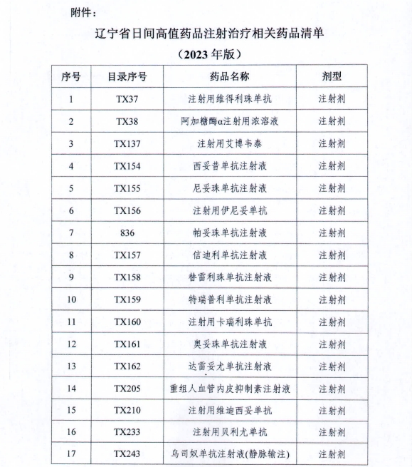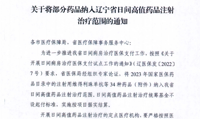现将辽宁省医疗保障局办公室《关于将部分药品纳入辽宁省日间高值药品注射治疗范围的通知》(辽医保办〔2024〕56号)转发给你们,请认真贯彻落实。