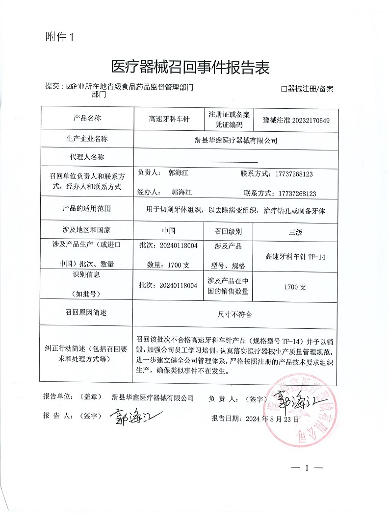 滑县华鑫医疗器械有限公司报告,由于其生产的一批次高速牙科车针不符合规定,企业对其主动召回,召回级别为三级。召回产品的型号、规格及批次等详细信息见《医疗器械召回事件报告表》。