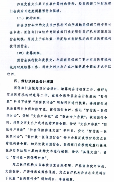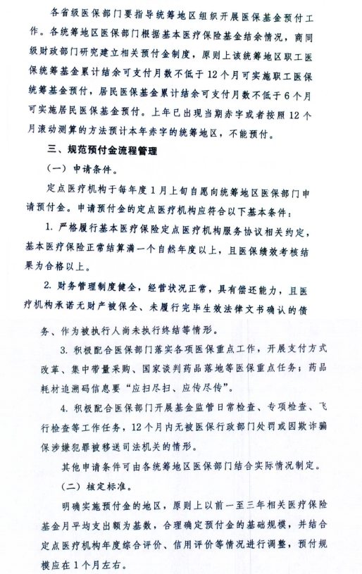 1.按照《通知》中医保基金、申请条件、核定标准及医保绩效考核结果等相关规定,经市医保部门预付金专项审核小组先行审核后,商市财政部门确定预付医疗机构范围和预付金额度。