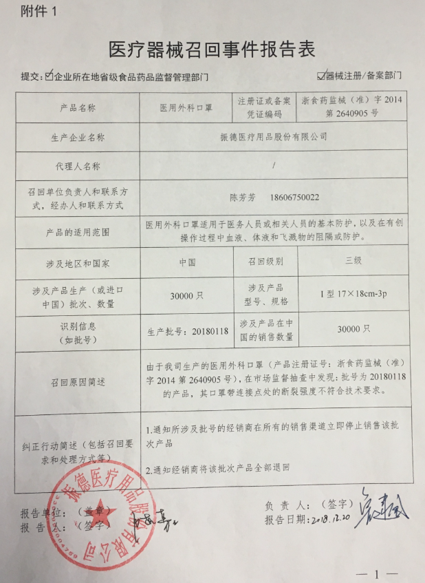 振德医疗用品股份有限公司报告,由于在国家医疗器械监督抽检中发现该口罩带连接点处的断裂强度不符合技术要求,振德医疗用品股份有限公司对其生产的医用外科口罩(注册证号:浙食药监械(准)字2014第2640905号)主动召回。召回级别为三级。涉及产品的型号、规格及批次等详细信息见《医疗器械召回事件报告表》。