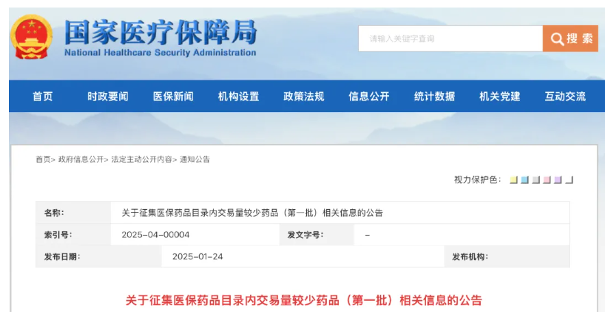 2025年1月24日,国家医保局发布《关于征集医保药品目录内交易量较少药品(第一批)相关信息的公告》,表示发现部分药品长期未在省级医药采购平台交易或交易量较少,有的药品在国家医保信息业务编码标准数据库中的市场状态长期维护为“停产”。