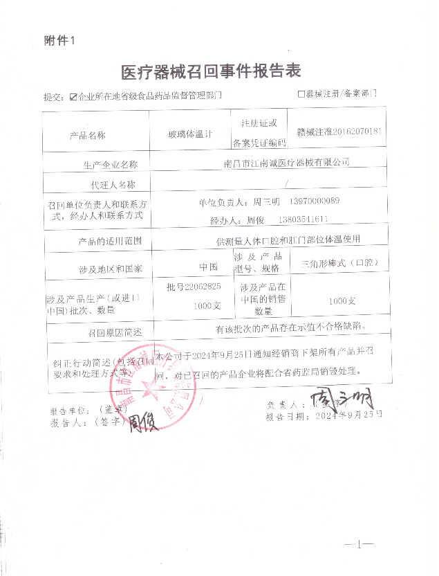 南昌市江南诚医疗器械有限公司报告,由于有该批次的产品存在示值不合格缺陷等原因,南昌市江南诚医疗器械有限公司对其生产的玻璃体温计(注册备案号:赣械注准20162070181)主动召回,召回级别为三级,涉及产品的型号、规格及批次等详细信息见《医疗器械召回事件报告表》。