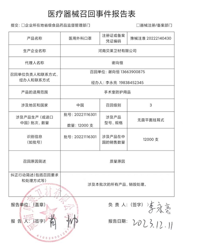 河南贝莱卫材有限公司报告,由于其生产的一批次医用外科口罩不符合规定,企业对其主动召回,召回级别为三级。召回产品的型号、规格及批次等详细信息见《医疗器械召回事件报告表》。