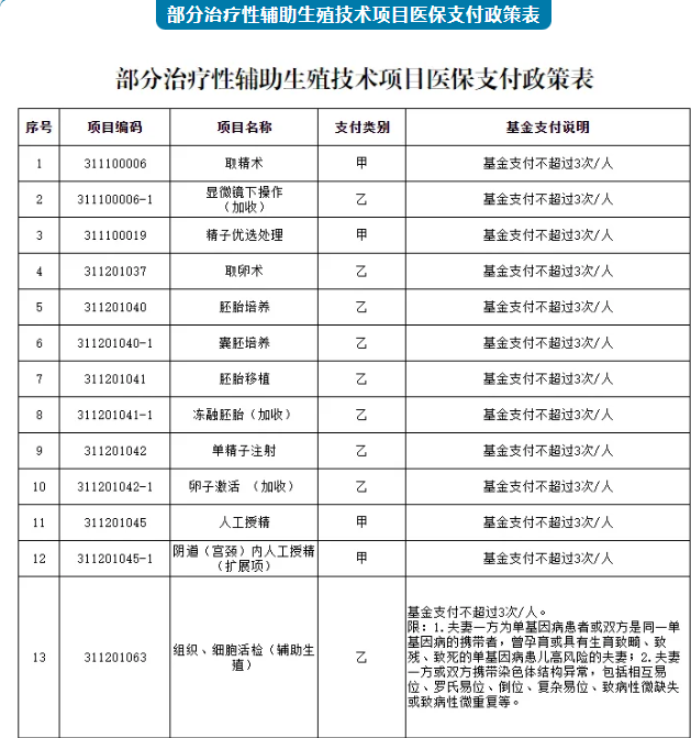 将“取卵术”等13项治疗性辅助生殖类医疗服务项目纳入医保基金支付范围,其中甲类项目4项,乙类项目9项,乙类项目个人先行自付比例为10%。