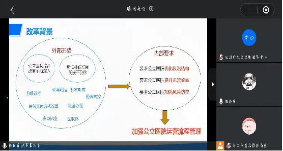 本次培训我局邀请了原海南省肿瘤医院运营主任薛伟贤进行授课。主要从医保支付方式改革、成功经验分享、医保规范化管理和下一步管理建议等四个方面,对医保支付方式改革下医院运营管理及医保管理实践进行线上培训。