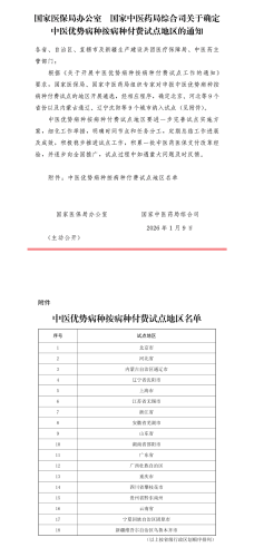 据国家医保局微信公众号29日消息,国家医保局办公室 国家中医药局综合司发布关于确定中医优势病种按病种付费试点地区的通知。通知指出,根据《关于开展中医优势病种按病种付费试点工作的通知》要求,国家医保局、国家中医药局组织专家对申报中医优势病种按病种付费试点的地区开展遴选,经相应程序,确定北京、河北等9个省份以及内蒙古通辽、辽宁沈阳等9个城市纳入试点。