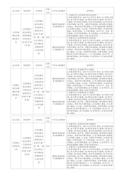 根据《医疗器械监督管理条例》和《医疗器械经营监督管理办法》的规定及有关要求,经审查合格,以下企业申请《医疗器械经营许可证》、第二类医疗器械经营备案变更业务符合有关规定,经我局同意,现将许可信息予以公示。