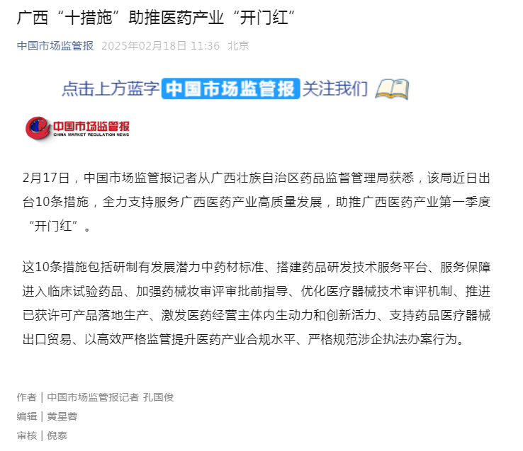 2月17日,中国市场监管报记者从广西壮族自治区药品监督管理局获悉,该局近日出台10条措施,全力支持服务广西医药产业高质量发展,助推广西医药产业第一季度“开门红”。