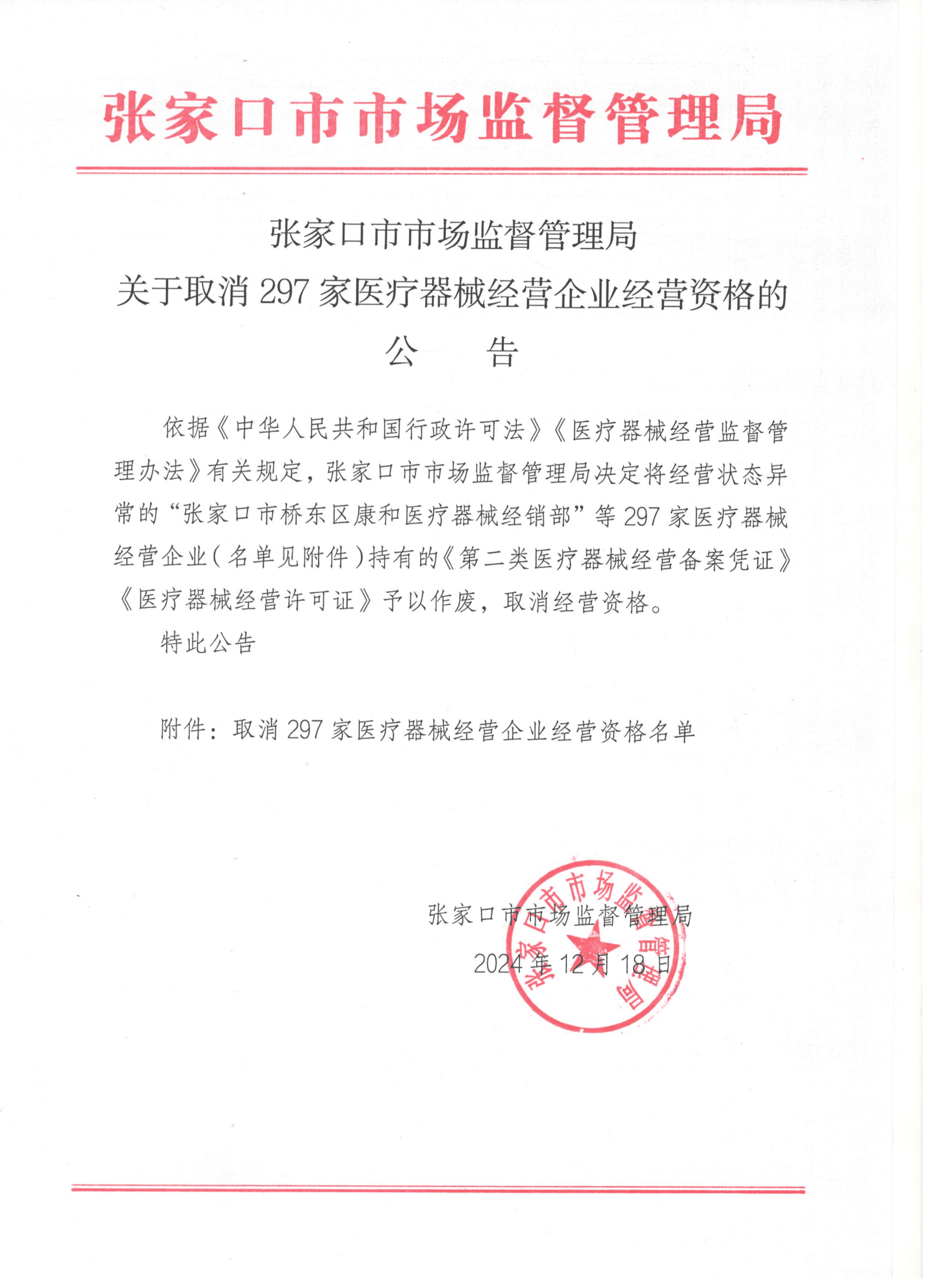 张家口市市场监督管理局关于取消297家医疗器械经营企业经营资格的公告