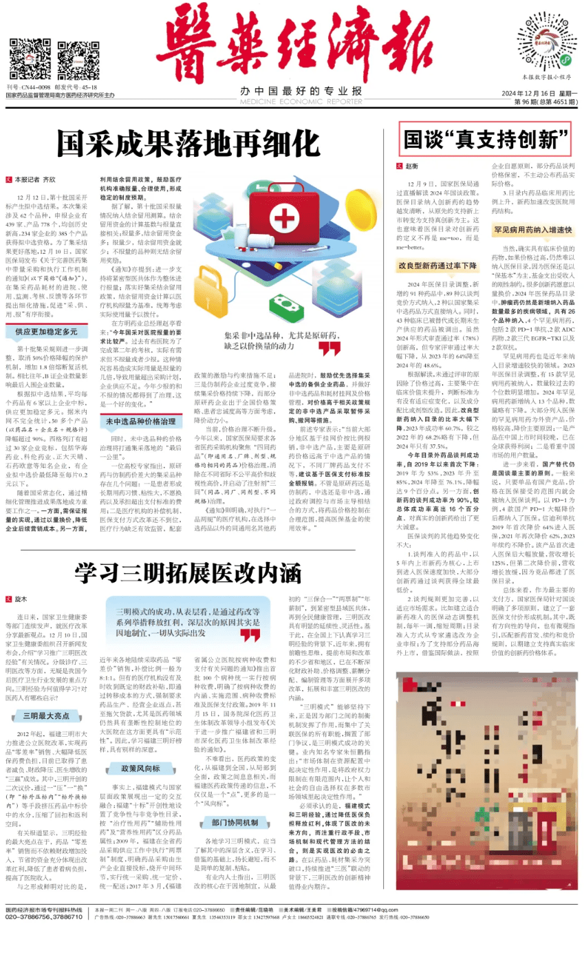 2.谈判规则更加完善,以适应市场需求。比如建立适合新药准入的医保动态调整机制,每年一调,缩短周期;目录准入方式从专家遴选改为企业申报;为了支持部分药品海外上市,借鉴国际做法,按照企业自愿原则,部分药品谈判价格保密,不主动公布药品实际价格。