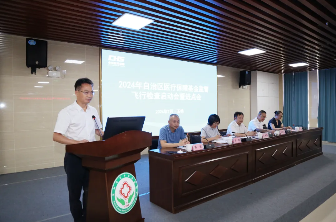 7月1日上午,自治区医保局在玉林市红十字会医院召开2024年自治区医疗保障基金监管飞行检查启动会暨进点会。自治区医保局基金监管处副处长吴嗣明,自治区飞行检查组组长、柳州市医保局副局长伍家友,玉林市医保局副局长陈东,市医保中心、市财政局、市卫生健康委有关领导,全市三级定点医疗机构及2024年自治区医疗保障基金监管飞行检查抽检的二级定点医疗机构主要领导、定点药店代表,以及自治区医疗保障基金监管飞行检查组全体成员共50余人参加会议。