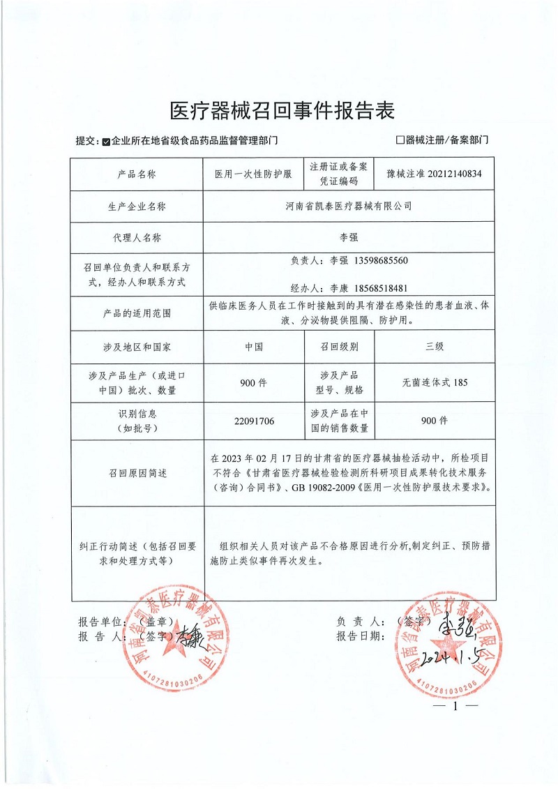 河南省凯泰医疗器械有限公司报告,由于其生产的两批次医用一次性防护服不符合规定,企业对其主动召回,召回级别为三级。召回产品的型号、规格及批次等详细信息见《医疗器械召回事件报告表》。