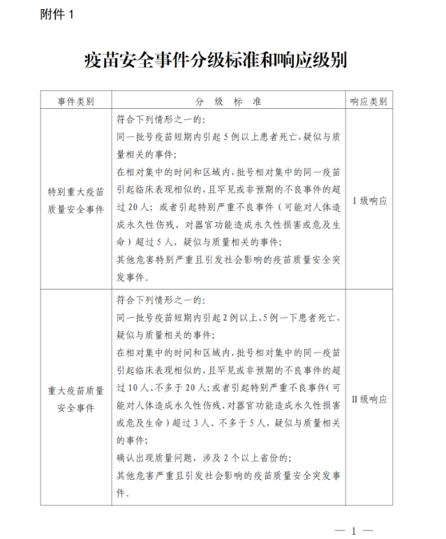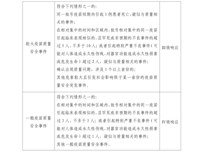 根据疫苗质量安全事件的分级,将应急响应设定为Ⅰ级、Ⅱ级、Ⅲ级和Ⅳ级四个等级。(具体分级标准见附件1)