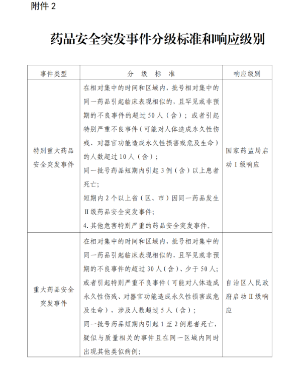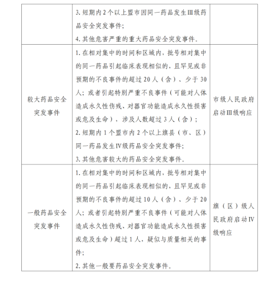 根据药品安全突发事件的分级,将应急响应设定为Ⅰ级、Ⅱ级、Ⅲ级和Ⅳ级四个等级。(具体分级标准见附件2)