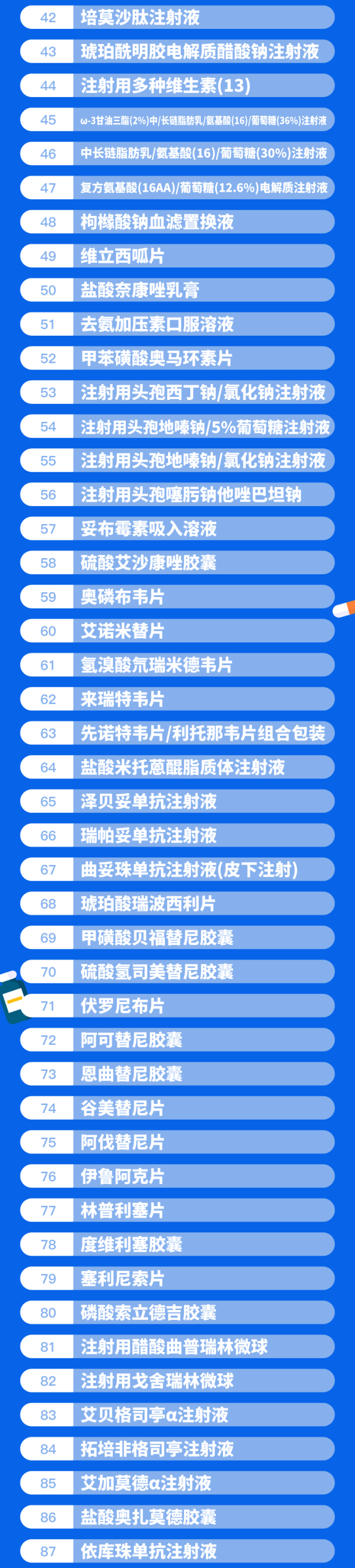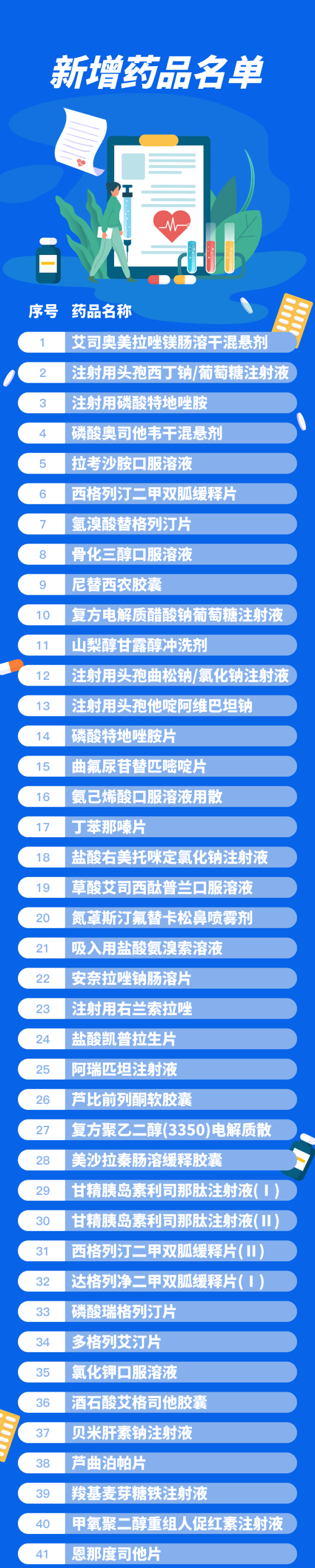 本次目录调整,国家医保药品目录共新增126种药品,其中包括肿瘤用药21种,新冠、抗感染用药17种,糖尿病、精神病、风湿免疫等慢性病用药15种,罕见病用药15种(其中阿伐替尼片同为肿瘤用药),其他领域用药59种。慢性病、罕见病、儿童用药等领域的保障水平得到明显提升。