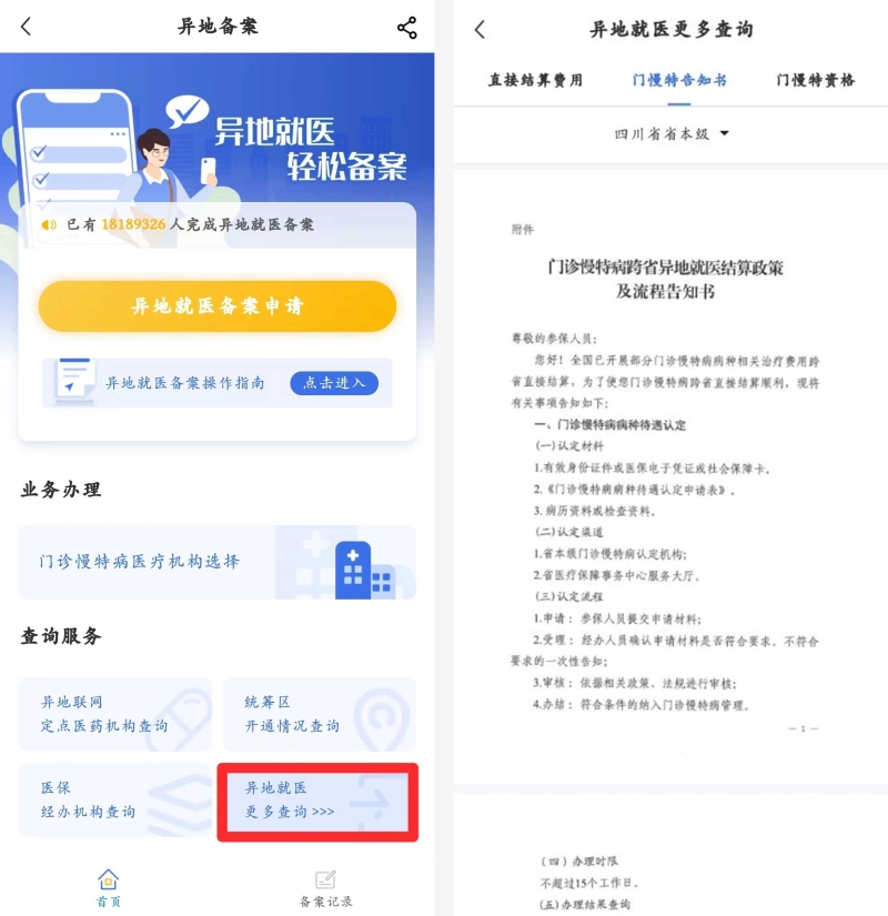 当您按照参保地规定完成医保门诊慢特病待遇认定后,可登录国家医保服务平台APP,在“异地备案”服务专区,点击查询服务下的“异地就医更多查询”-“门慢特告知书”,了解参保地门诊慢特病相关治疗费用跨省直接结算政策、结算流程等内容。