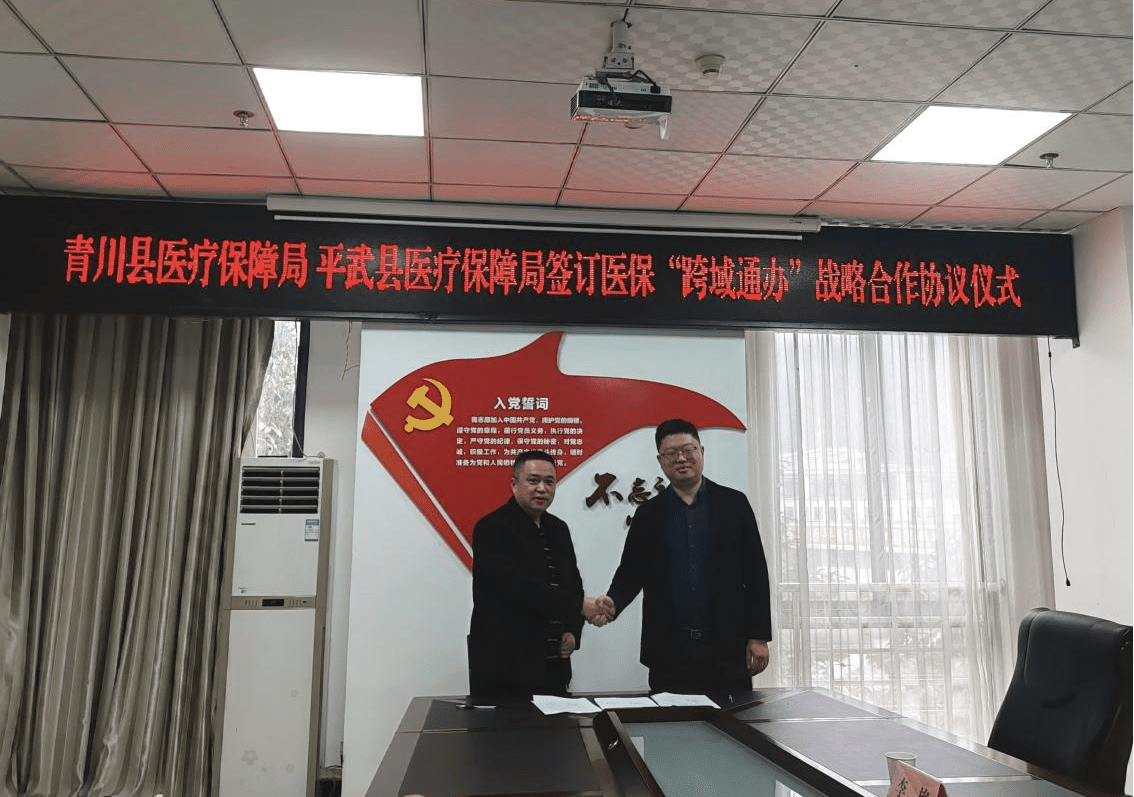 近日,青川县医疗保障局与平武县医疗保障局“跨域通办”战略合作协议签约仪式举行。青川县医保局党组书记、局长何平代表青川县医保局,同平武县医保局签订战略合作协议,青川县医保局领导班子,平武县医保局党组成员、副局长杨鑫及相关股室负责人参加。