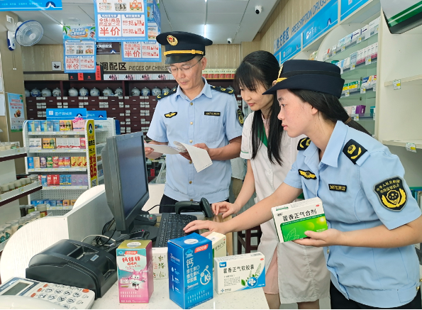 图为7月9日该局执法人员在一家药店检查夏季热销药品进销货台账等。