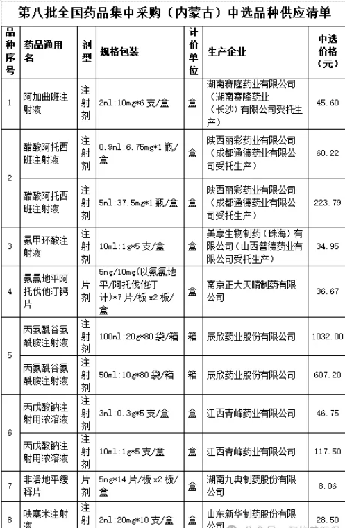 第八批国家组织药品集中带量采购共涵盖39种药品,涉及抗感染、心脑血管系统、血液和造血系统、神经系统、抗过敏等8个治疗领域。药品平均降幅56%,最高降幅达95.30%。例如:治疗甲型流感的磷酸奥司他韦干混悬剂(0.36g)集采前140元/盒,集采后24.8元/盒,降幅达82.29%。降压药非洛地平缓释片5mg*28片,集采后由1.76元/片降至0.29元/片,降幅达83.52%。另外治疗精神类疾病药品米氮平片、治疗骨质疏松类药品骨化三醇软胶囊,价格均显著下降。国家集采药品覆盖面逐批扩大,老百姓用药品种得到进一步丰富,用药负担也得到进一步减轻。全盟各级公立医疗机构均可采购国家集中带量采购药品。