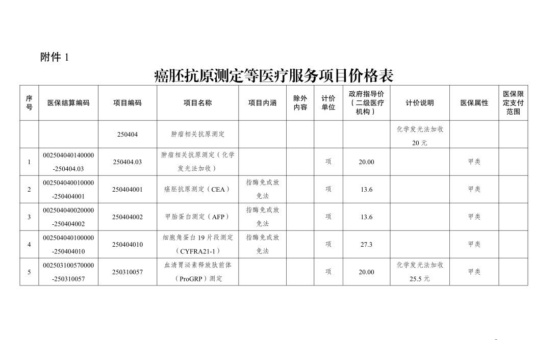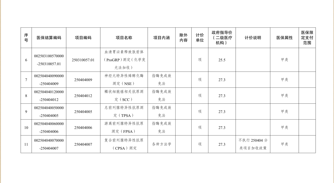 本次调整涉及的医疗服务项目:肿瘤相关抗原测定、癌胚抗原测定、甲胎蛋白测定、细胞角蛋白19片段测定、血清胃泌素释放肽前体测定、神经元特异性烯醇化酶测定、鳞状细胞癌相关抗原测定、总前列腺特异性抗原测定、游离前列腺特异性抗原测定、复合前列腺特异性抗原测定,价格最大降幅45.4%。