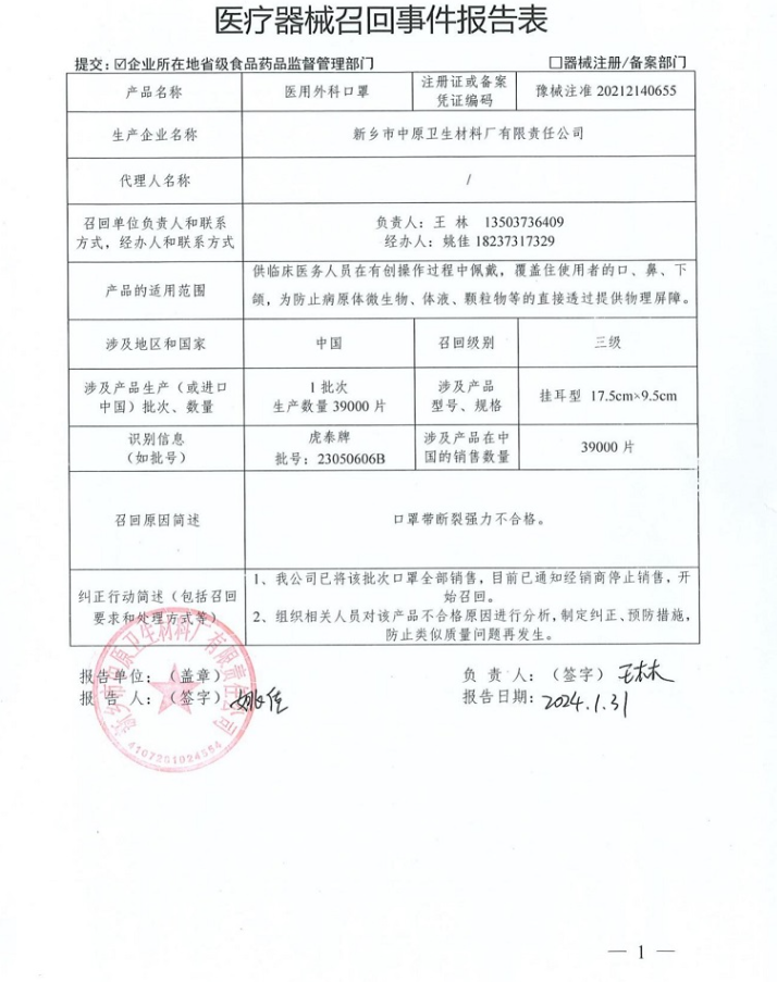 新乡市中原卫生材料厂有限责任公司报告,由于其生产的一批次医用外科口罩不符合规定,企业对其主动召回,召回级别为三级。召回产品的型号、规格及批次等详细信息见《医疗器械召回事件报告表》。