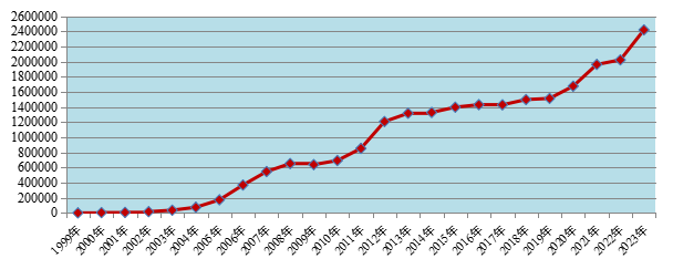 图1 1999年-2023年全国药品不良反应/事件报告数量增长趋势