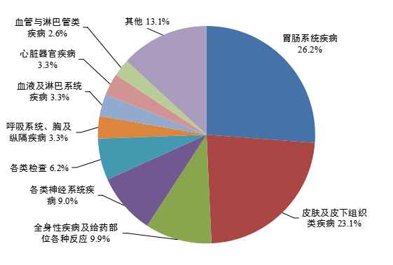 血液系统用药不良反应/事件总体报告中,口服制剂累及器官系统排名前5位的是胃肠系统疾病,皮肤及皮下组织类疾病,呼吸系统、胸及纵隔疾病,各类检查,全身性疾病及给药部位各种反应;注射剂累及器官系统排名前5位是胃肠系统疾病、皮肤及皮下组织类疾病、全身性疾病及给药部位各种反应、各类神经系统疾病、各类检查。