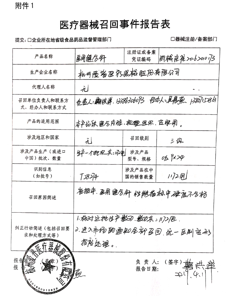 浙江爱普医疗器械股份有限公司报告,由于在省医疗器械质量监督抽验中其生产的医用缝合针性能指标中硬度不合格,浙江爱普医疗器械有限公司对该医用缝合针(注册证号:浙械注准20162010173号)主动召回。召回级别为三级。涉及产品的型号、规格及批次等详细信息见《医疗器械召回事件报告表》。