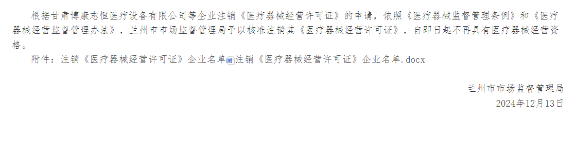 关于甘肃博康志恒医疗设备有限公司等企业的医疗器械经营许可注销通告