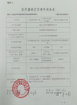 杭州山友医疗器械有限公司报告,由于黑龙江省药品监督管理局抽检中其生产的一次性使用医用口罩耳带拉力不符合规定,该公司对其生产的一次性使用医用口罩(注册证号:浙械注准20202141048号)主动召回。召回级别为三级。涉及产品的型号、规格及批次等详细信息见《医疗器械召回事件报告表》。