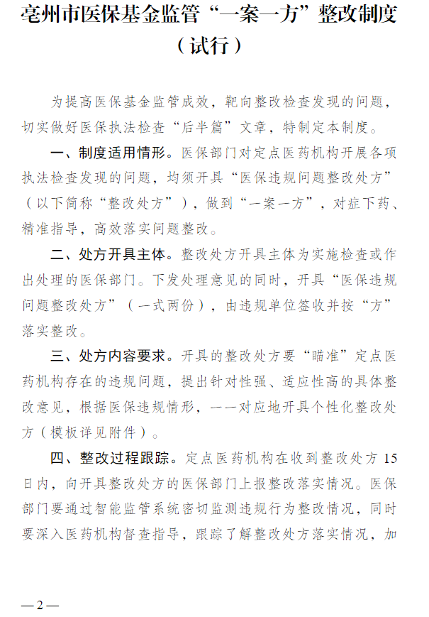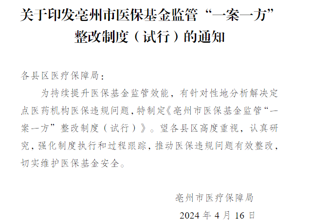 为持续提升医保基金监管效能,有针对性地分析解决定点医药机构医保违规问题,特制定《亳州市医保基金监管“一案一方”整改制度(试行)》。望各县区高度重视,认真研究,强化制度执行和过程跟踪,推动医保违规问题有效整改,切实维护医保基金安全。