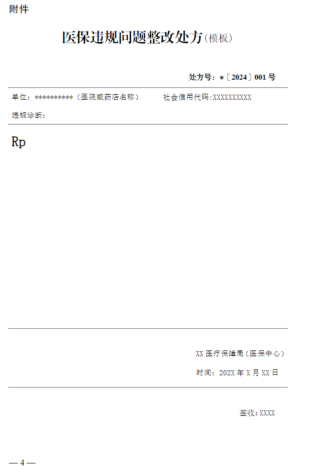 三、处方内容要求。开具的整改处方要“瞄准”定点医药机构存在的违规问题,提出针对性强、适应性高的具体整改意见,根据医保违规情形,一一对应地开具个性化整改处方(模板详见附件)。
