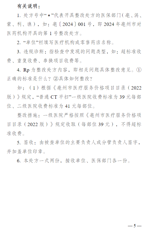 1. 处方号中“ * ”代表开具整改处方的医保部门(亳、涡、蒙、利、谯),如:亳〔2024〕001号,即2024年亳州市对医药机构开具的第1号整改处方。