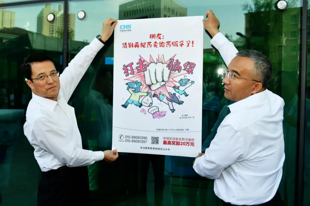 章轲局长与凯赛尔·阿不都克热木副主席在新疆维吾尔自治区人民医院共同张贴新疆塔城市第六中学程靖瑶画的打击骗保宣传画
