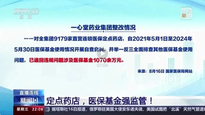国家医保局基金监管司监管事务处负责人 徐友龙:实际上在这次5月份的约谈之前,我们各地医保部门在医保基金的日常监管中,发现一心堂旗下一些定点连锁门店所存在的一些较为典型的违法违规使用医保基金的行为。考虑到一心堂旗下的门店比较多,医保基金的用量又比较大,为了防止出现更大的问题,我们国家医保局基金监管司决定对一心堂进行了约谈,在约谈中提出了很多具体的要求,目的是督促提醒一心堂加强管理,规范行为,切实履行医保基金的自我管理的主体责任,更好维护医保基金的安全。