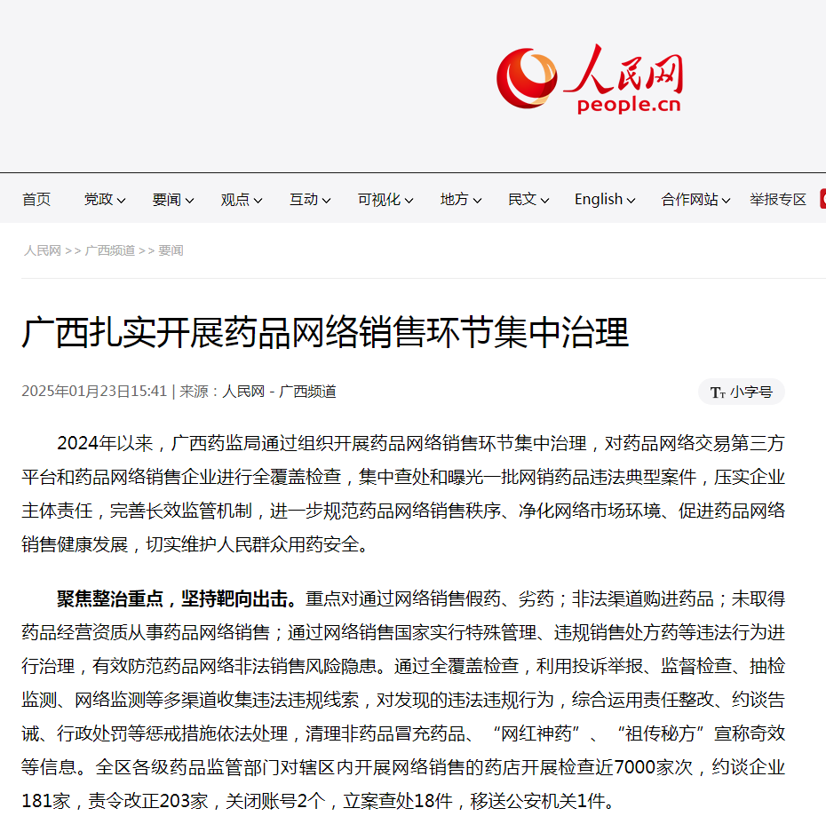 2024年以来,广西药监局通过组织开展药品网络销售环节集中治理,对药品网络交易第三方平台和药品网络销售企业进行全覆盖检查,集中查处和曝光一批网销药品违法典型案件,压实企业主体责任,完善长效监管机制,进一步规范药品网络销售秩序、净化网络市场环境、促进药品网络销售健康发展,切实维护人民群众用药安全。