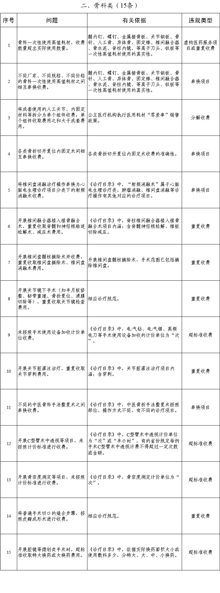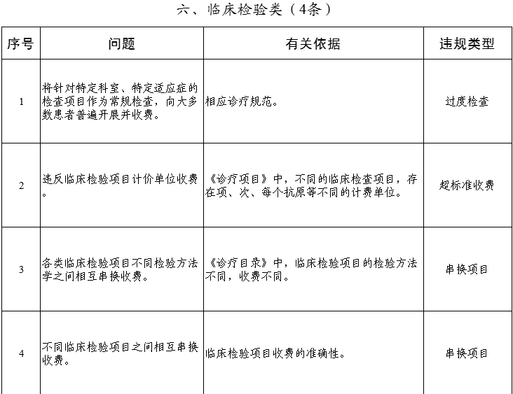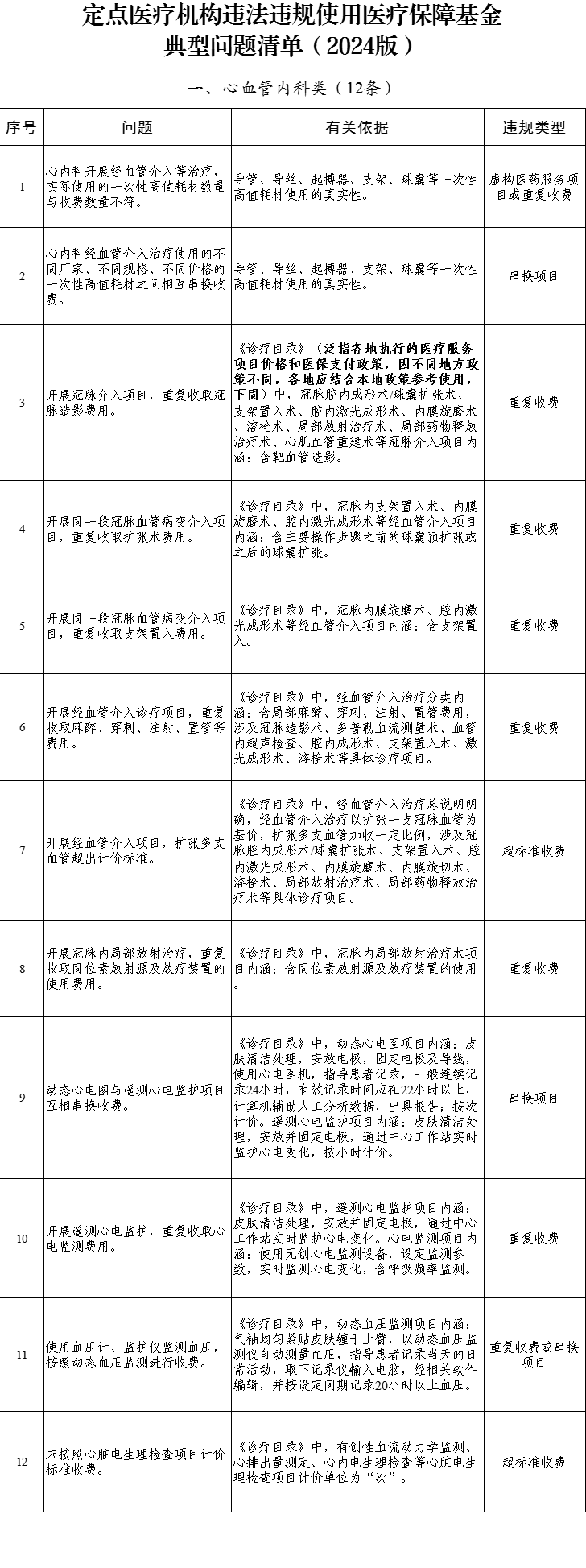 2024年4月,国家医疗保障局联合财政部、国家卫生健康委、国家中医药局印发了《关于开展2024年医疗保障基金飞行检查工作的通知》,正式启动2024年度全国医保基金飞行检查工作,同时梳理了心血管内科、骨科、血液净化、康复、医学影像、临床检验六个领域常见的违法违规典型问题,向各地下发了《定点医疗机构违法违规使用医疗保障基金典型问题清单》,要求各省按照《问题清单》,结合本地政策,组织辖区内定点医疗机构开展自查自纠,及时主动退回违法违规使用的医保基金。