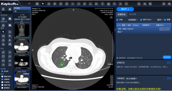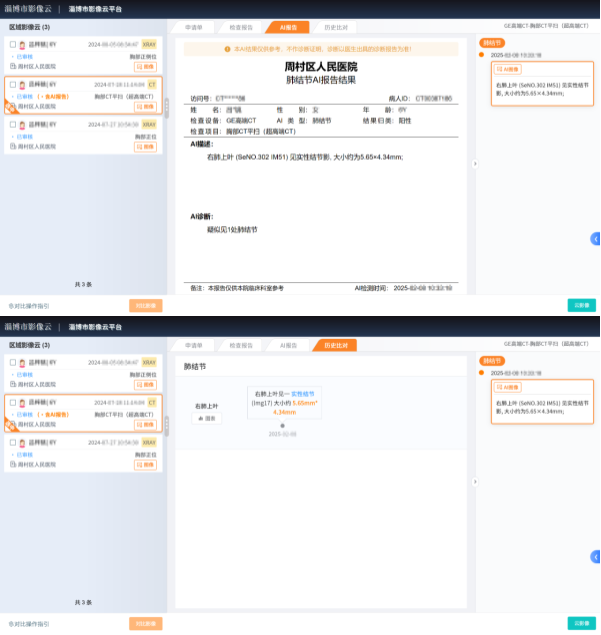 影像AI辅助诊断:点击列表带有“AI报告”提醒的记录,可查看具体AI报告信息及AIPACS,可以直接调阅肺结节AI分析服务实时影像,历史比对功能,有利于观察分析结节病灶的动态变化,对于随访未增大的结节病灶,能够减轻患者压力,减少CT检查照射次数,降低患者辐射剂量,减少医保费用支出。