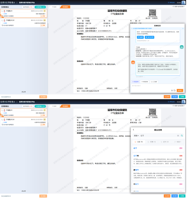 智能分析报告的表现及结论,可对影像报告进行智能纠错,检测错别字、语法错误、逻辑矛盾(如性别矛盾、部位矛盾等),确保报告的准确性和规范性,大幅提升报告排版效率。结合AI模型和大语言模型技术,对报告内容进行完整性、科学性评估,支持事中和事后的质控管理,自动对比初级医生和审核医生的报告,分析差异,为质控管理提供依据。