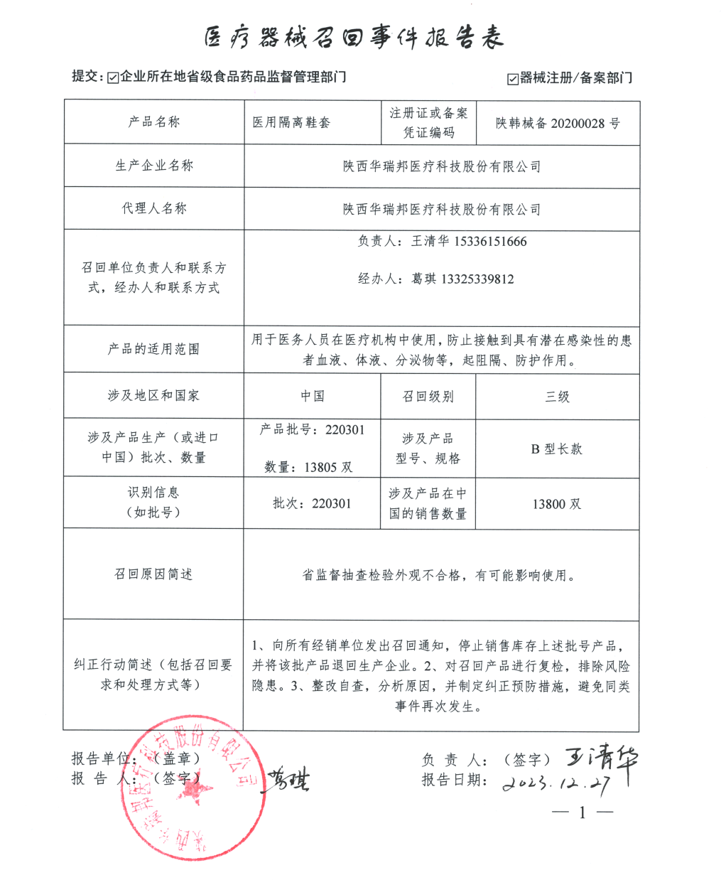 根据陕西华瑞邦医疗科技股份有限公司召回公告,由于该公司生产的医用隔离鞋套(生产批号22031)外观不符合注册技术要求,陕西华瑞邦医疗科技股份有限公司对其生产的医用隔离鞋套(生产批号22031)主动召回(详见附表),召回级别为三级。