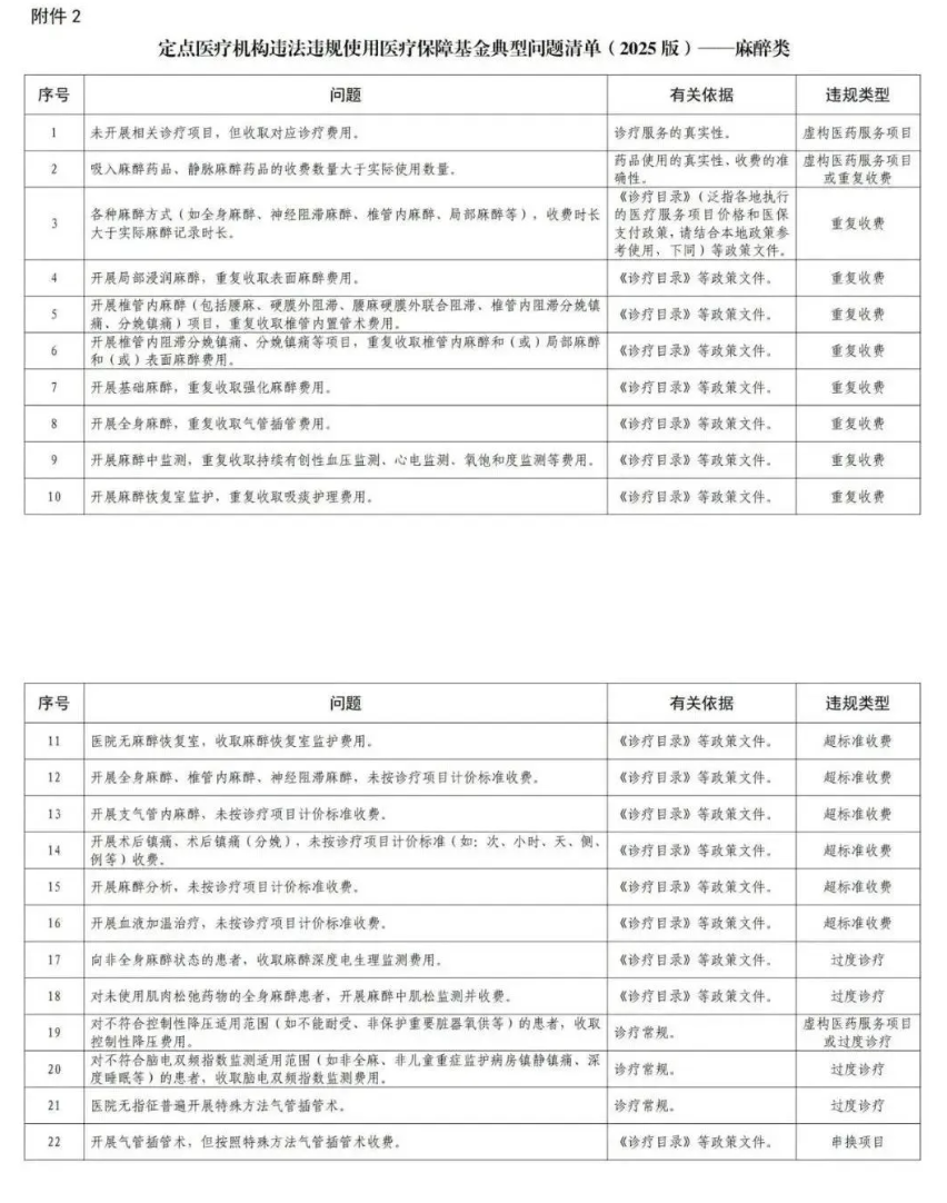 2、定点医疗机构违法违规使用医疗保障基金典型问题清单(2025版)——麻醉类