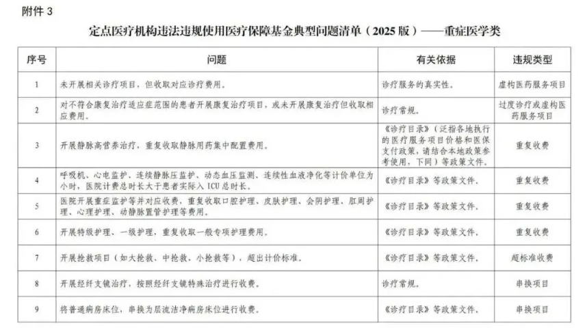 3、定点医疗机构违法违规使用医疗保障基金典型问题清单(2025版)——重症医学类