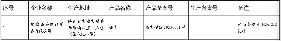 根据《医疗器械监督管理条例》《医疗器械注册与备案管理办法》等相关规定,经企业主动申请,对宝鸡高盛医疗用品有限公司的1个产品备案证予以注销,现将注销信息向社会公布。