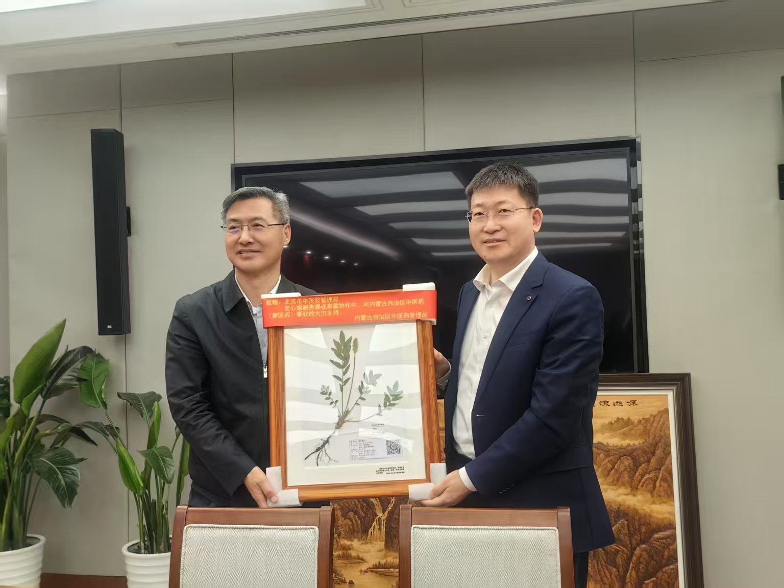 伊乐泰副主任向北京市中医药管理局罗增刚局长赠送中药材(蒙药材)标本,感谢北京市中医药管理局在京蒙协作中,对内蒙古自治区中医药(蒙医药)事业的大力支持。