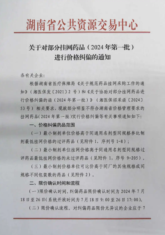 日前,湖南省公共资源交易中心发布《关于对挂网药品(2024年第一批)进行价格纠偏的通知》,公示了234个明显不符合湖南省价格管理要求的挂网药品。
