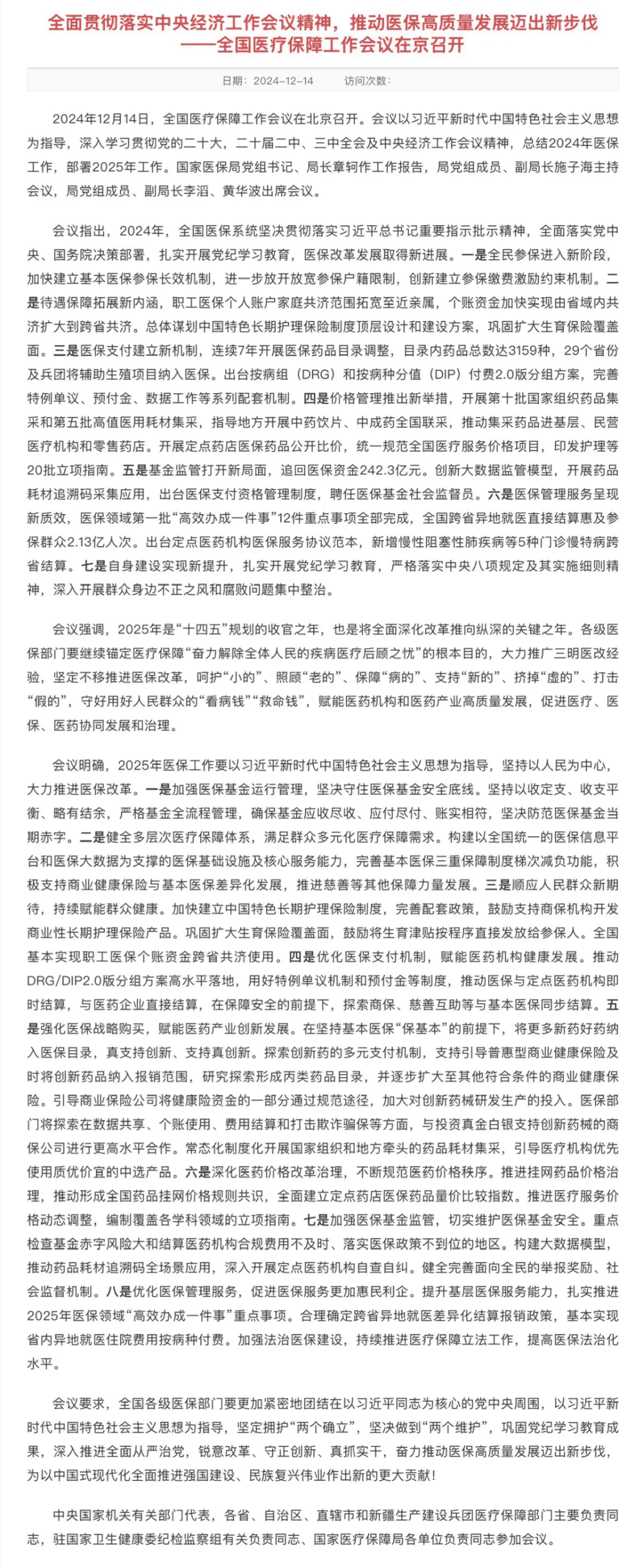 会上,国家医保局对2025年医保工作划出八大重点(文末附全文)。