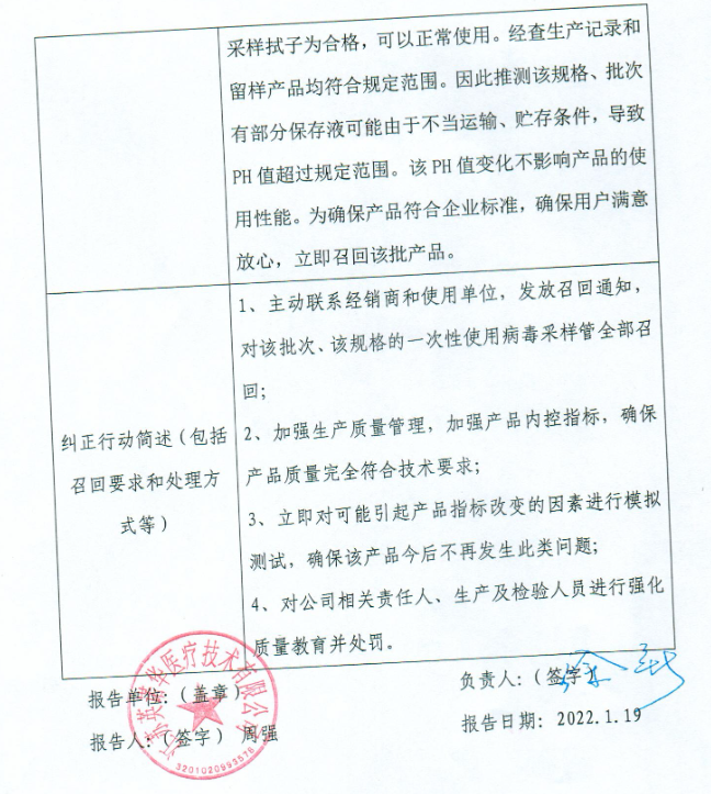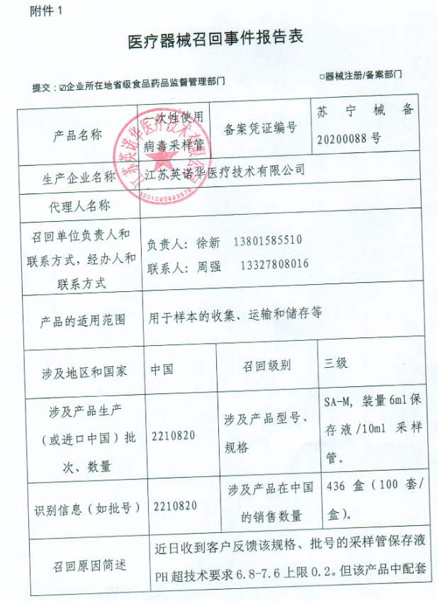 江苏英诺华医疗技术有限公司报告,该企业收到客户反馈,一次性使用病毒采样管中的保存液超技术要求,现主动召回,召回级别为三级。涉及产品的具体信息见《医疗器械召回事件报告表》