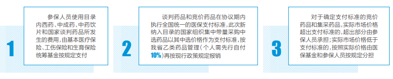 根据《2024年药品目录》,参保人员使用目录内西药、中成药、中药饮片和国家谈判药品所发生的费用,由基本医疗保险、工伤保险和生育保险统筹基金按规定支付,支付办法按我省现行规定执行。谈判药品和竞价药品在协议期内执行全国统一的医保支付标准,此次新纳入目录的国家组织集中带量采购中选药品(以下简称集采药品)以其中选价格作为支付标准,上述谈判药品、竞价药品和集采药品按我省乙类药品管理(个人需先行自付10%)再按现行政策规定报销,各相关单位不得进行二次议价。对于确定支付标准的竞价药品和集采药品,实际市场价格超出支付标准的,超出部分由参保人员承担;实际市场价格低于支付标准的,按照实际价格由医保基金和参保人员按规定分担。同一通用名药品有多家企业生产的,定点医疗机构和“双通道”药店应优先配备价格不高于支付标准的药品,支持其临床使用,减轻患者负担。