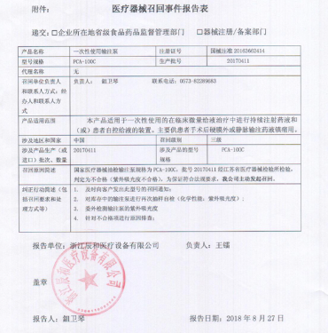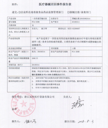浙江辰和医疗设备有限公司报告,由于在国家医疗器械监督抽检中发现该产品紫外吸光度不合格,浙江辰和医疗设备有限公司对其生产的一次性使用输注泵(注册证号:浙械注准20163662414)主动召回。召回级别为三级。涉及产品的型号、规格及批次等详细信息见《医疗器械召回事件报告表》。